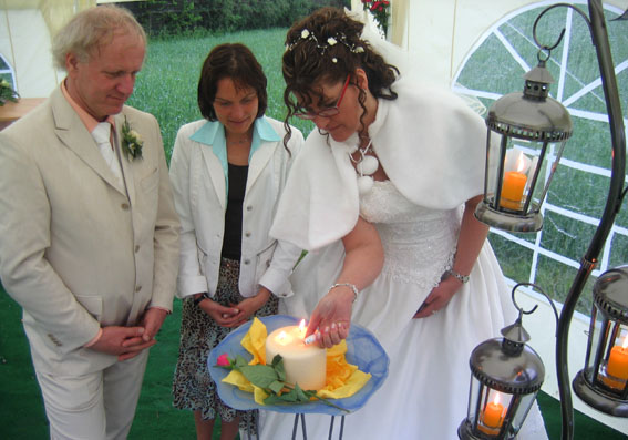 Und als weiterer Ausdruck unserer Verbundenheit zünden Sylke Rita und Dhyan gemeinsam eine Kerze mit drei Dochten an.