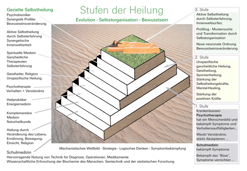 - “Systeminstabilität” führte zum Sterben. Auch die komplementär arbeitenden Ärzte arbeiten nur auf der Körperebene - also nur auf einem der 6-8 Einflußparameter und auch dort wird nur das Symptom bekämpft und nicht tiefer hinterfragt, “WARUM ?” diese Zelle sich so verhält, denn es entspricht nicht ihrer evolutionären Aufgabe. Die Seele-Körperverbindung wird missachtet. |