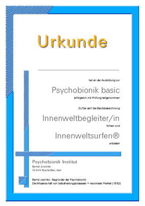 Nur wer diese Urkunde nachweisen kann, kann korrekte Innenweltarbeit durchführen, die nicht mit Psychotherapiemethoden vergleichbar ist, weil die Grundlage der Psychobionik die naturwissenschaftliche Evolutionsbionik ist.