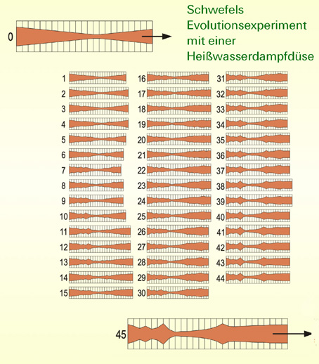 Düse für Druckluftdurchsatz zu optimieren hatte. Ohne von den Forschungen von Rechenberg und Schwefel zu wissen, entwickelte er eine ähnliche Versuchsanordnung, bei der die Düse aus 100 Plexiglasscheibchen hergestellt wurde. Diese Scheibchen wurden dann willkürlich gezogen und an eine andere Stelle gesteckt. Ergab sich eine Verbesserung, wurde die Änderung beibehalten, verschlechterte sich der Durchsatz, wurde der Vorgang rückgängig gemacht. Nach 150 Schritten war die optimale Form gefunden. Es ergab sich ein um 300% verbesserter Durchsatz des sekundären Energieflusses. Die mathematischen Berechnungen wurden nachträglich ebenfalls durchgeführt. |
